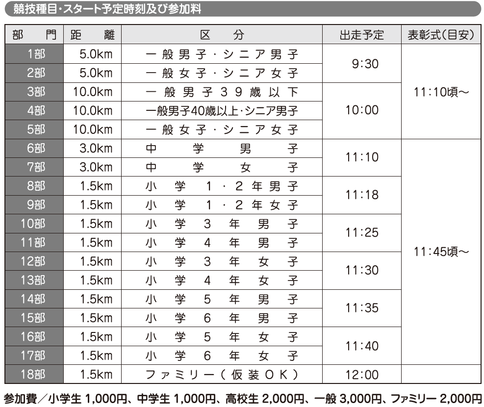 ・競技部門1~17部の各1~6位まで及びシニア4部門の各1位を表彰 ・参加者全員に順位・記録をインターネット上で確認できるWeb完走証を発行します ・参加者全員(組)に参加賞を進呈 ・その他「播磨町賞」「仮装大賞」等のお楽しみ賞あり |
